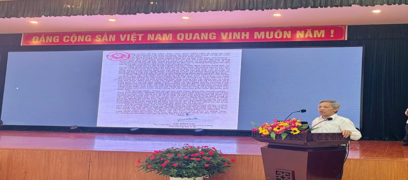 Mở đầu buổi lễ, ĐDCKI. Nguyễn Bá Tòng, Trưởng phòng Điều dưỡng và Công tác xã hội đọc thư của Bộ trưởng Bộ Y tế gửi đội ngũ những người làm công tác xã hội. Nội dung bức thư thể hiện sự quan tâm sâu sắc của lãnh đạo ngành đối với công tác xã hội, đồng thời ghi nhận và biểu dương những đóng góp tích cực của đội ngũ thực hiện công tác xã hội trong việc hỗ trợ người bệnh, kết nối cộng đồng và nâng cao chất lượng dịch vụ y tế.