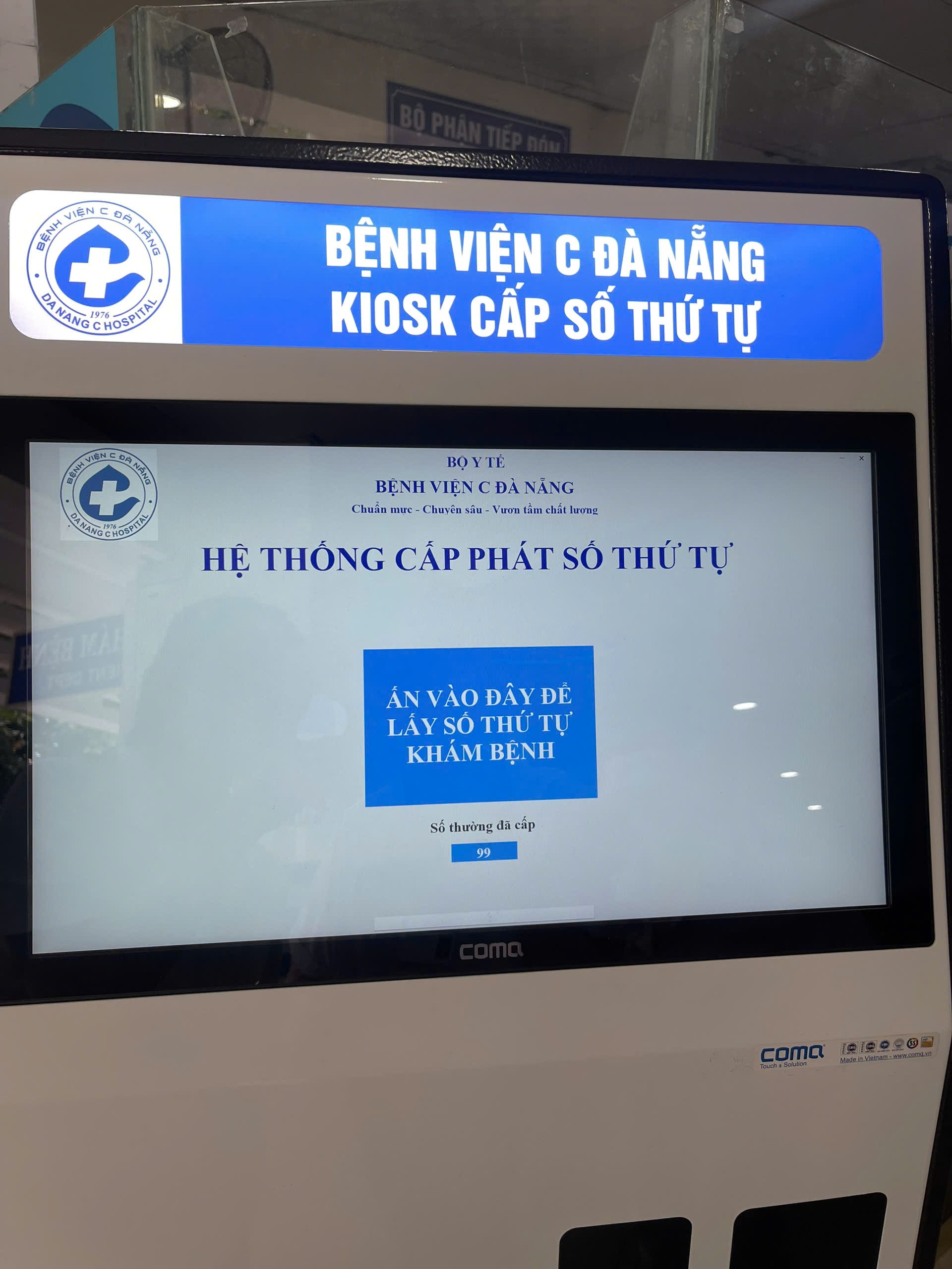 Bước 1: Đến khu vực đặt máy Kiosk cấp số thứ tự tại cửa ra vào của khu vực phòng khám: