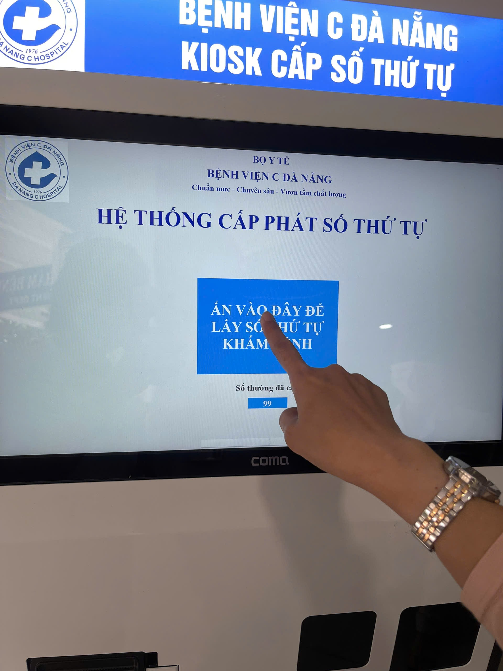 Trên màn hình máy Kiosk, bạn sẽ thấy nút màu xanh rất lớn, chỉ cầm chạm tay vào nút này (Hình 3).