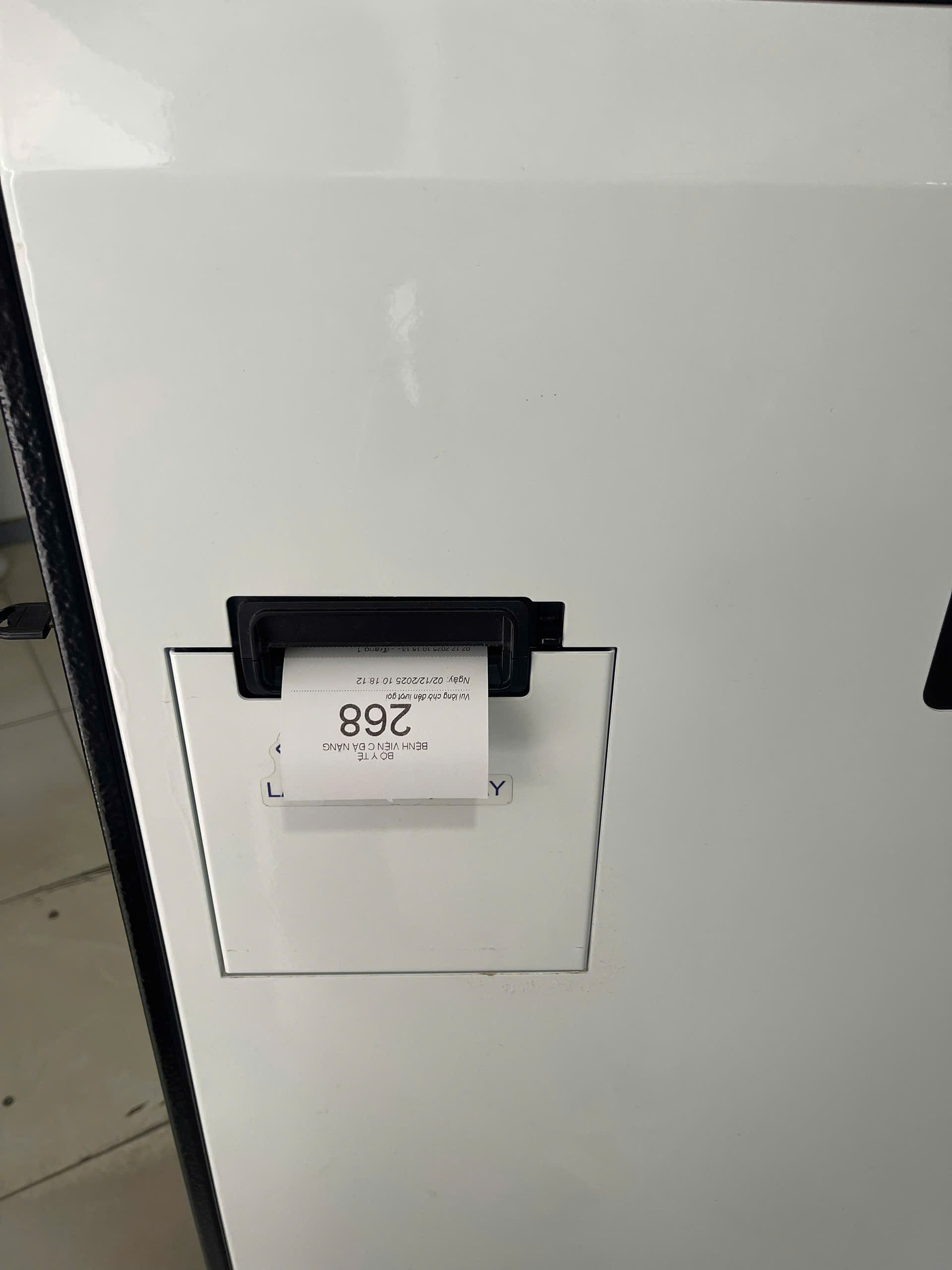 Máy in tại vị trí thân máy Kiosk sẽ in một phiếu nhỏ có in số thứ tự của bạn (Hình 4). Thông tin trên phiếu gồm: Số thứ tự (ví dụ: 268), thời gian lấy số