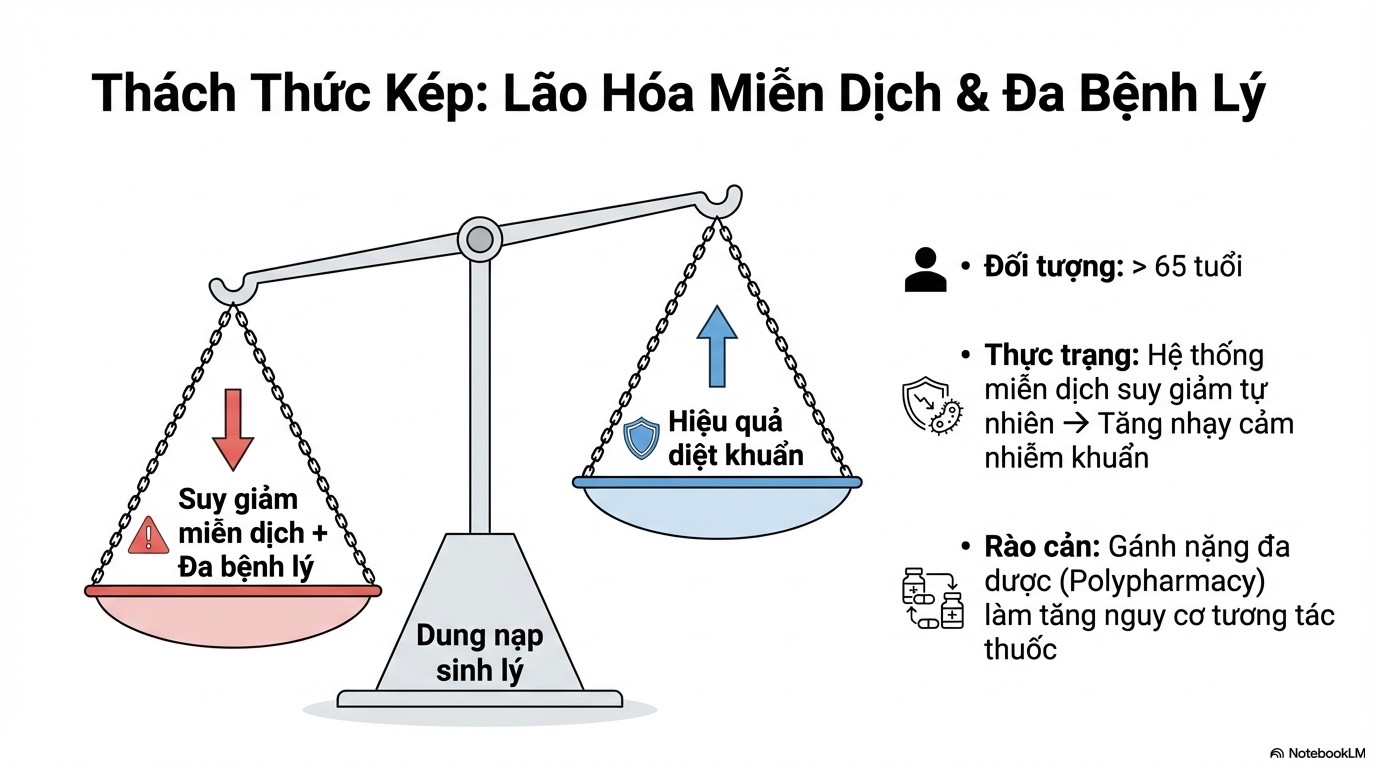 Trong bối cảnh tuổi thọ trung bình ngày càng tăng, tỷ lệ người cao tuổi (NCT) trong cộng đồng cũng gia tăng nhanh chóng. Dù có nhiều cải thiện về chẩn đoán và kháng sinh mới, các bệnh nhiễm trùng như viêm phổi, nhiễm trùng niệu, nhiễm trùng da và mô mềm… vẫn là nguyên nhân hàng đầu gây bệnh và tử vong ở nhóm đối tượng này. Điều trị nhiễm trùng ở NCT là một thách thức lớn do những thay đổi sinh lý liên quan đến tuổi tác, tình trạng đa bệnh lý và sự thay đổi về dược động học, dược lực học của thuốc.