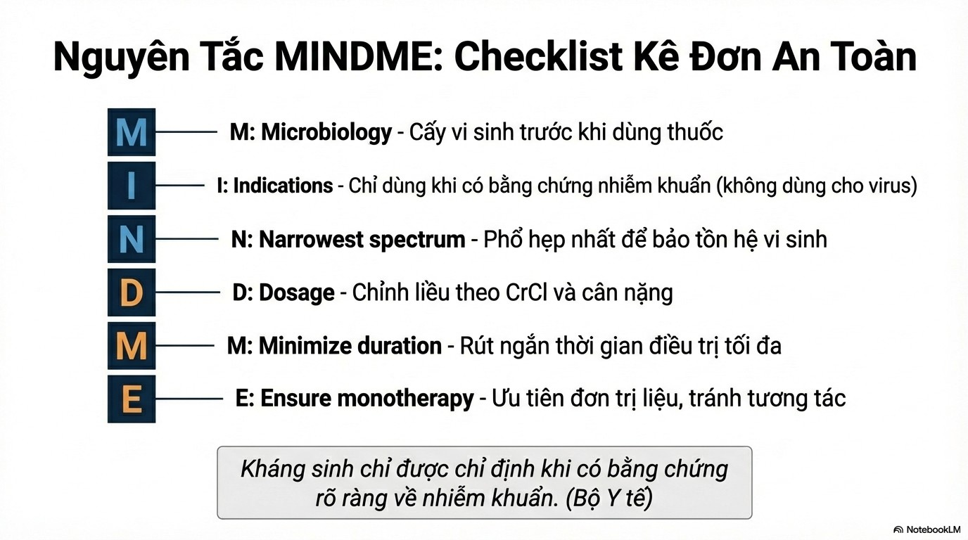 - Đúng chỉ định: Chỉ dùng kháng sinh khi có bằng chứng nhiễm khuẩn. Không dùng kháng sinh cho các trường hợp nhiễm virus.
