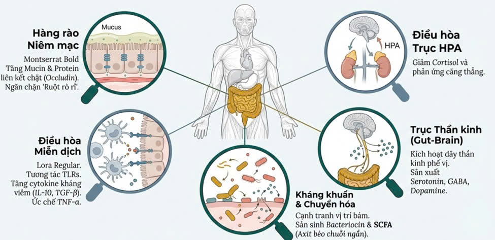 Hệ tiêu hóa chứa hơn 1.000 loài vi khuẩn với số lượng lên tới 1014 vi sinh vật, tạo nên một hệ sinh thái phức tạp. Đáng chú ý, hơn 50% hệ thống miễn dịch của cơ thể tập trung tại ruột, được gọi là “Miễn dịch đường ruột”. Probiotic hoạt động thông qua việc tương tác với các tế bào biểu mô và tế bào miễn dịch qua các thụ thể nhận diện tác nhân. Quá trình này kích thích sản sinh các cytokine kháng viêm như IL−10 và đồng thời ức chế các tác nhân gây viêm hệ thống như TNF−α và IL−6.