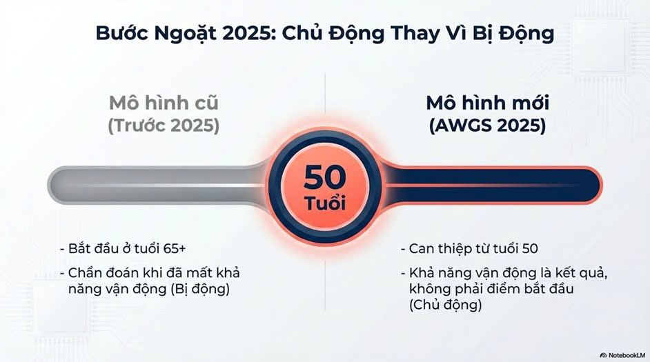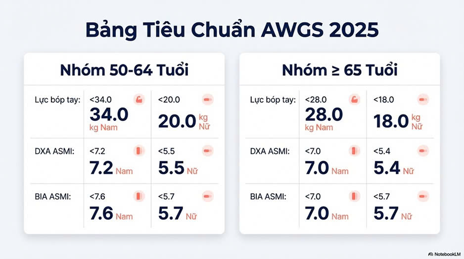 Hiệp hội thiếu cơ châu Á (AWGS): năm 2025 đã mở rộng đối tượng sàng lọc xuống từ 50 tuổi, thay vì đợi đến 65 tuổi như trước đây. Triết lý mới nhấn mạnh rằng khả năng vận động ở tuổi già là kết quả của việc xây dựng vốn cơ bắp suốt đời, không phải chỉ là điểm bắt đầu của quá trình chẩn đoán.