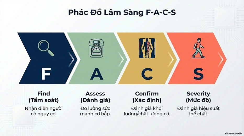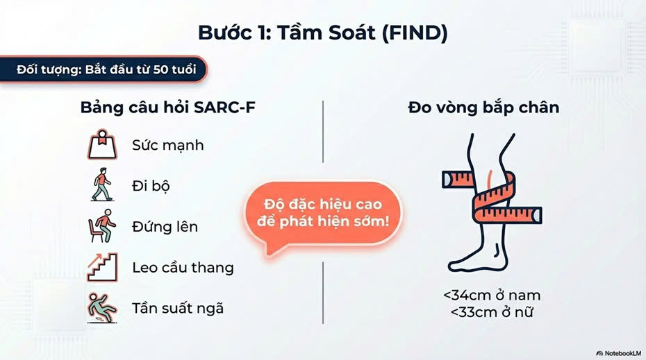 Bước 1: Tầm soát: Sử dụng bộ câu hỏi SARC-F (đánh giá sức mạnh, đi bộ, đứng lên, leo cầu thang, té ngã) hoặc đo chu vi bắp chân. Ngưỡng cắt tại Việt Nam được đề xuất là <34cm ở nam và <33cm ở nữ.